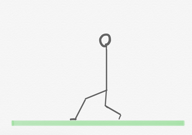 可能であれば、画像のところよりも更に深くおろして、後ろの足のスネが水平になるところまで下ろしてみましょう。注意点は、前にある足の膝が足よりも前に行かないこと。すると股関節、膝が両足ともに直角になります。
