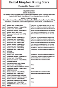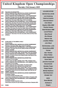 今年のUK選手権は、 2020年 1月21日、22日,23日に開催されます。 1月21日:プロスタンダード ライジング、プロラテンライジング 1月22日:プロスタンダード本戦 1月23日:プロラテン本戦 このホームページでも結果速報してゆきたいと思います。 公式サイトはこちら タイムテーブル 1日目ライジング